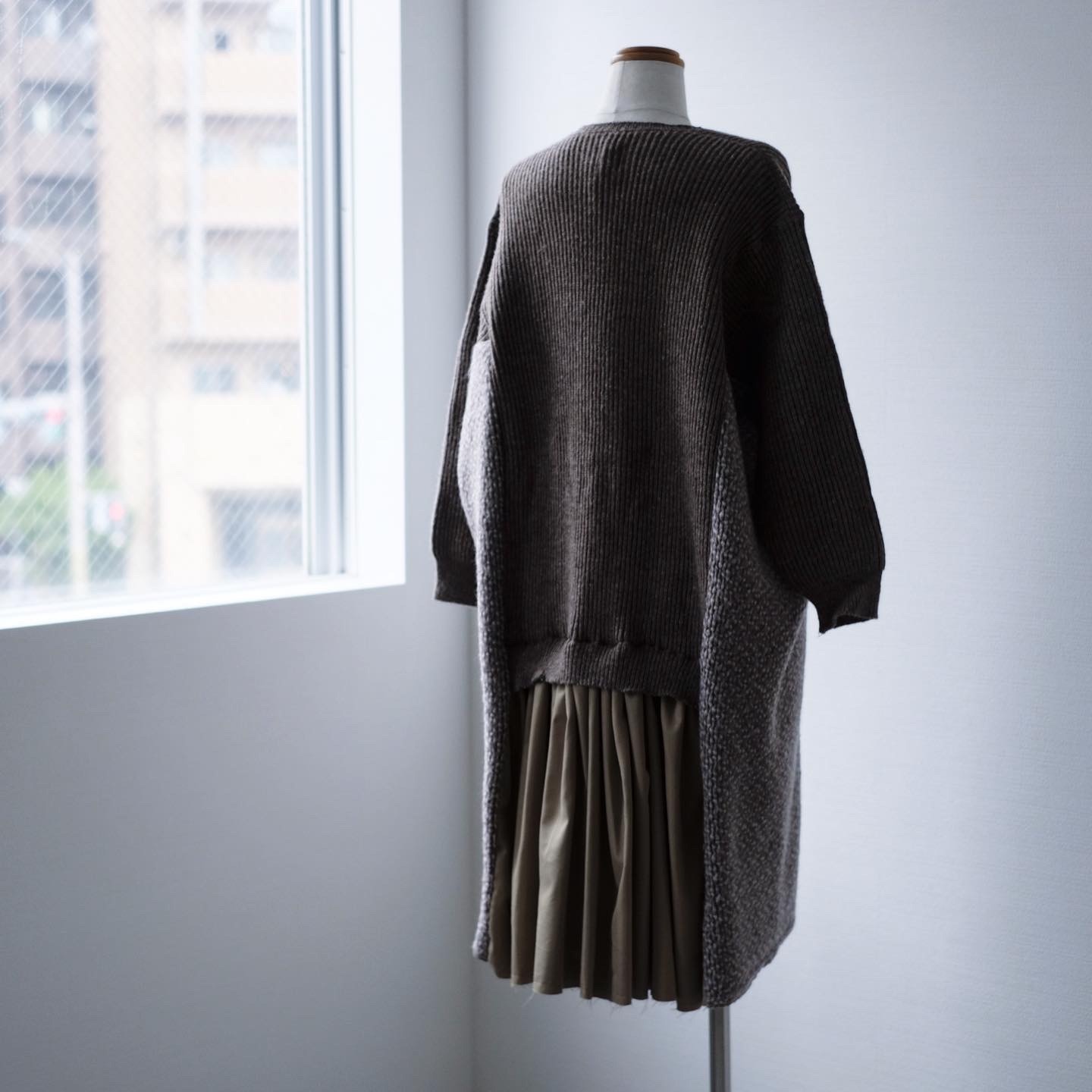 素材感の違うギャザーや編み方の違うニットの合わせなどバランスも拘った一枚です。