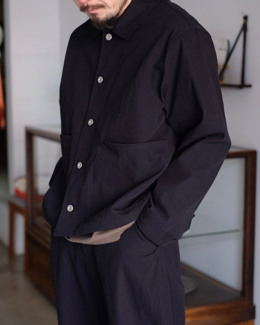 強撚されたガスコーマ糸は耐久性を高めるとともに、適度なハリ感を持ちエンジニアジャケットとしてのタフさもしっかり表現されています