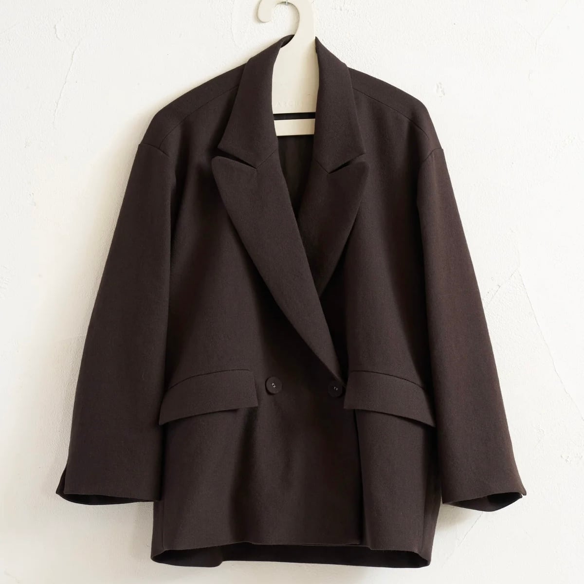 ゆったりとしたオーバーサイズのダブルジャケットは、くるみボタンをアクセントに。