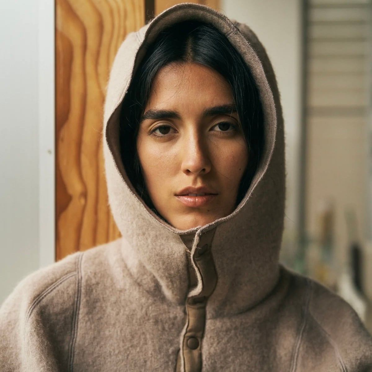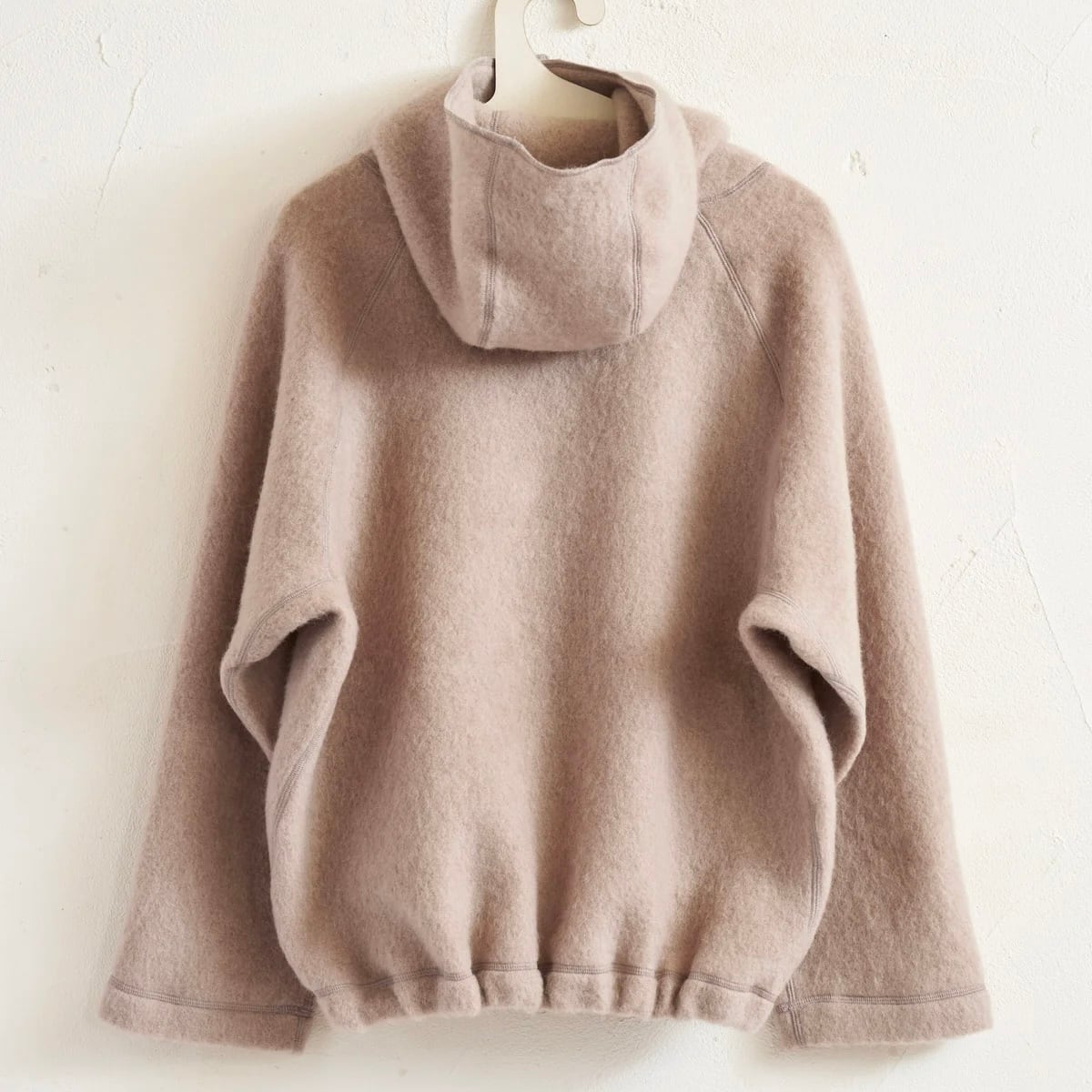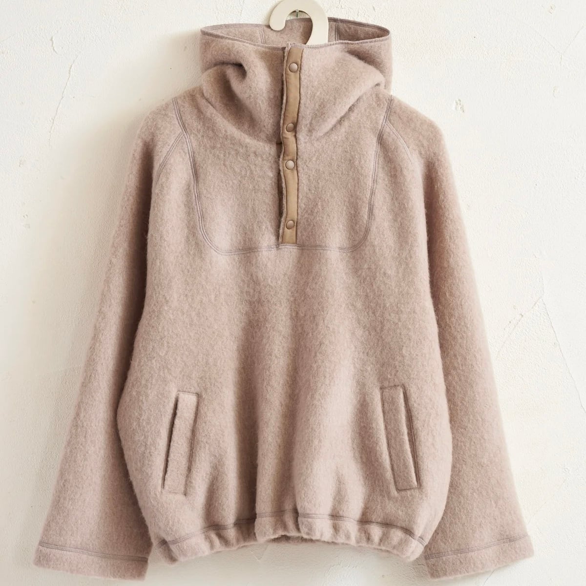 前スナップ開きのフード付きプルオーバー型で、裾のドローコードによりシルエットの調整も可能。