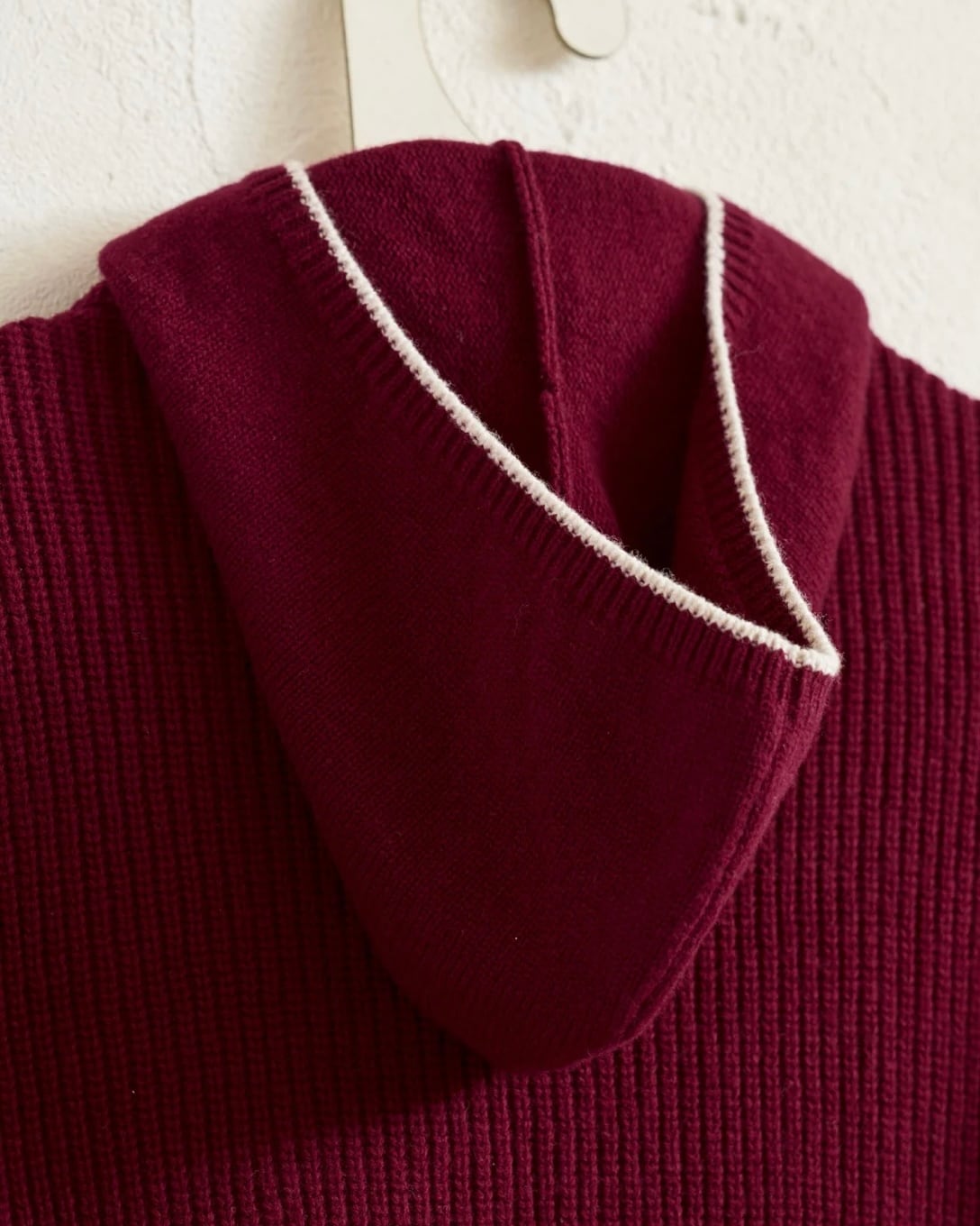 カシミヤのように滑らかで、軽く暖かな上質ウールを使用したフーディニット。フードまわりには繊細な配色ラインを施し、程よいアクセントに。首元まで暖かく包み込みつつ、脱いでも邪魔にならない絶妙なサイズ感のフードが魅力です。