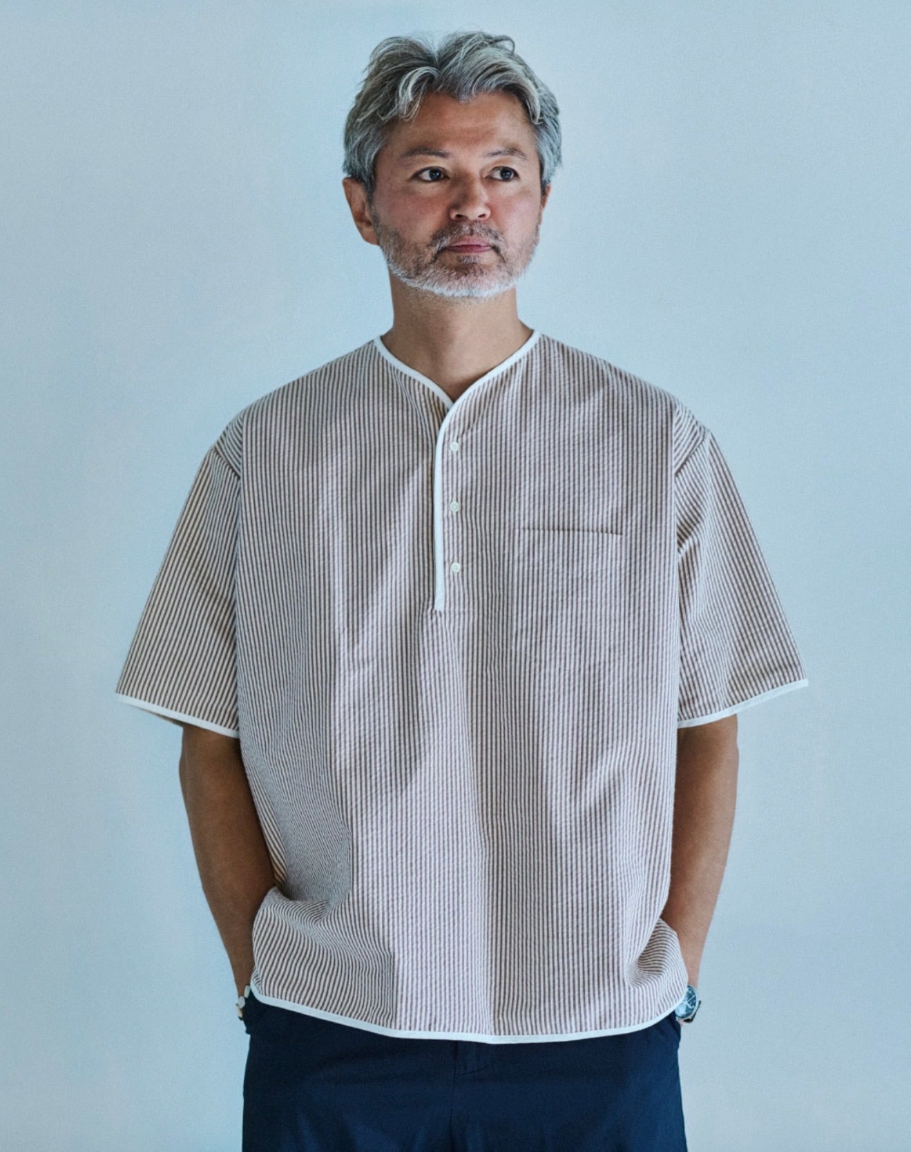 1953年創業のスペインの SIDOGRAS 社によるシアサッカー生地はナチュラルな雰囲気で、シボ感のある生地が肌離れが良く涼やかな着心地を感じることができます。
